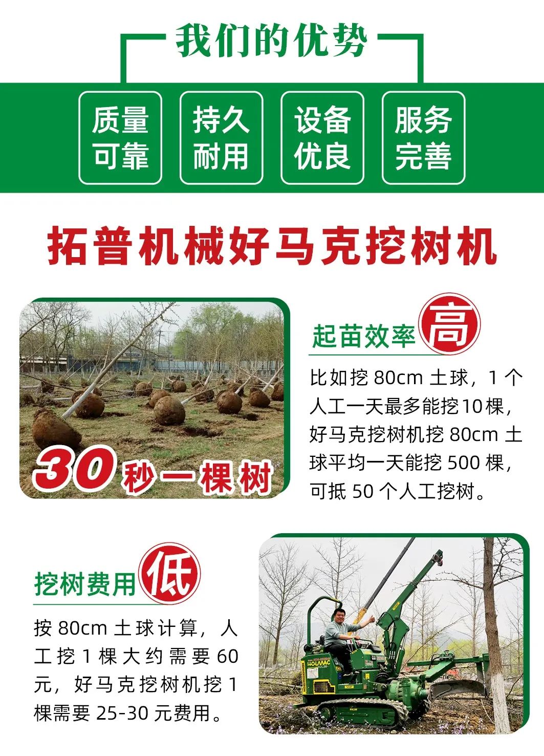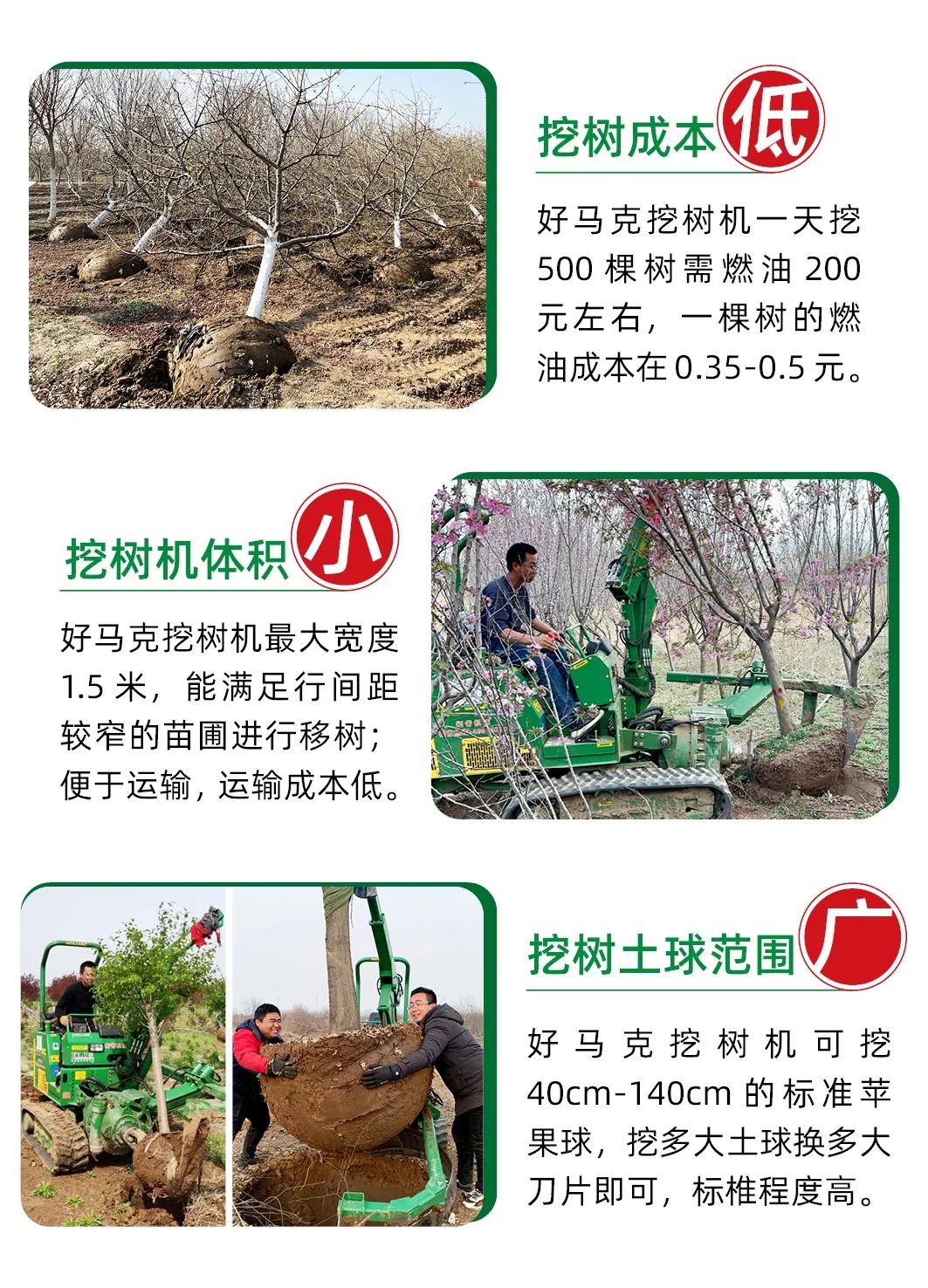 2、挖樹費用低。相對於人工挖樹,按80厘米土球計算人工挖樹1棵需要60元費用,但好馬克91香蕉视频APP污挖一棵僅需要25-30元費用。
